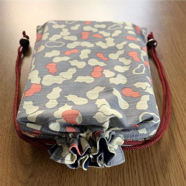 ちょっと大きめサイズの巾着なので、普段のお出掛けにも便利です。縫製は日本で1個ずつ丁寧にしています。裏地は落ち着いた色の生地を使用しています。