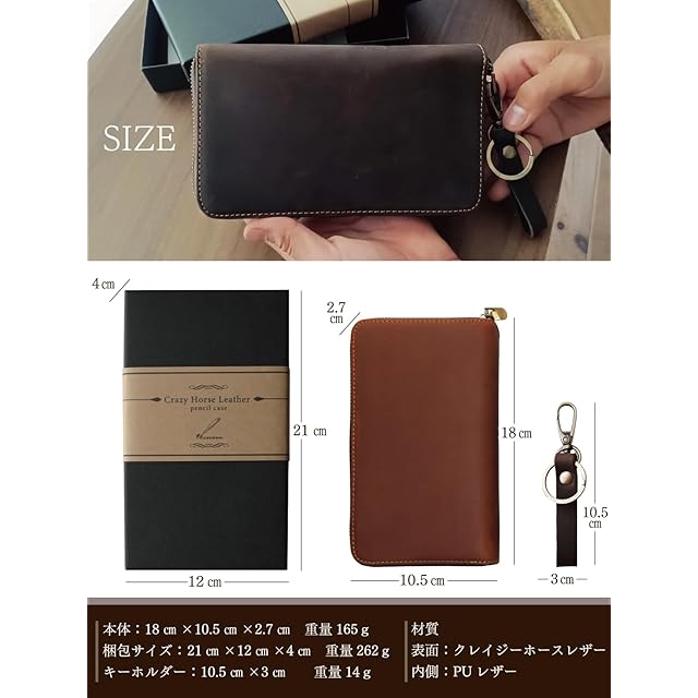 【仕様】素材: クレイジーホースレザーのペンケース&キーホルダーのセット。ラウンドファスナー。化粧箱に入れてお届けいたします。 ◆本体:18㎝×10.5㎝×2.7㎝ 重量165g ◆キーホルダー:10.5㎝×3㎝ 重量14g ◆箱サイズ21㎝×12㎝×4㎝ トータル重量262g