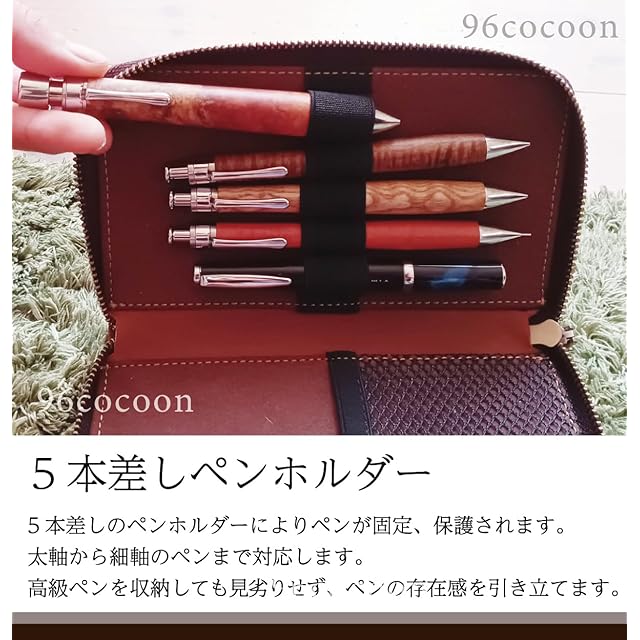 96cocoon 本革ペンケース レザー クレイジーホース 大人 革筆箱 万年筆ケース ペン保護 5本差し ホルダー付き (キャメル)