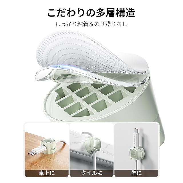 【跡が残らない特殊接着剤】底面には、跡を残さない特殊な接着剤を採用しており、木材、大理石、ガラスなどの表面にしっかりと貼り付きます。誤って貼り付けても心配無用。ゆっくり引き離すだけで、跡が残ることなくスムーズに取り外せます。