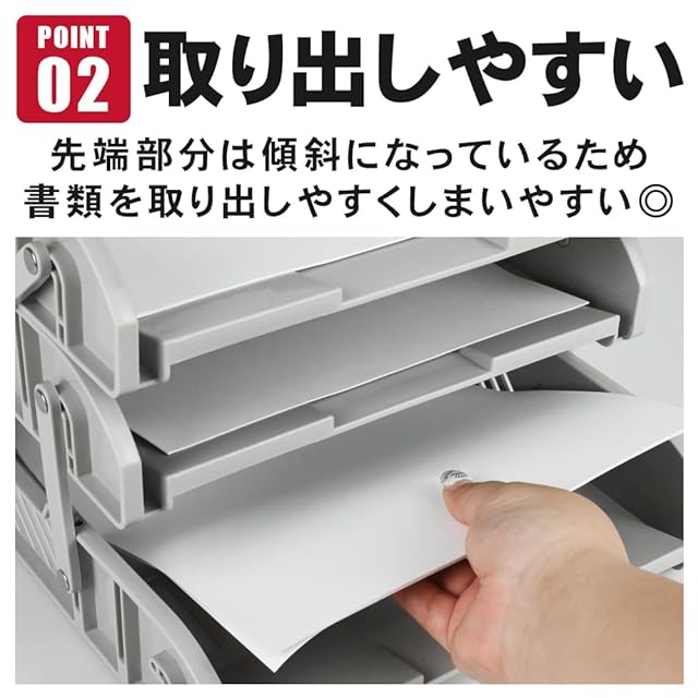 1段ずつずらして階段状にしたり、真っすぐ縦3段にしたりと自由に変形できます。用途や書類の量に合わせてお好みの使い方ができるところが魅力の1つです。