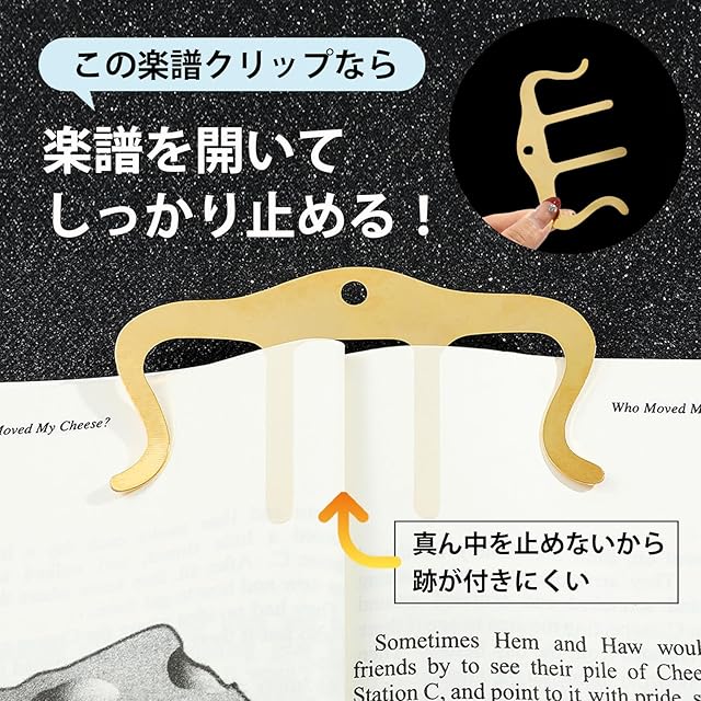 ★楽譜を開いてしっかり止める!:真ん中を止めないから跡がつきにくく、分厚い楽譜もしっかりと固定します