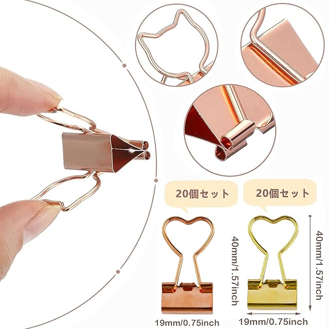 【商品詳細】:ダブルクリップ40個入。サイズ:19 mm、とじ枚数約40枚。色:ローズゴールド20個、ゴールド20個。大容量でさまざまなニーズを満たすことができます。