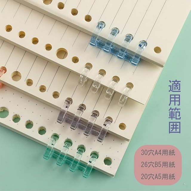 商品仕様:ピンク、パープル、透明、イエロー、グリーン、ブルー各2個、合計12個。 サイズ:リング径:15mm、一個高さ32mm。この本リングは30穴A4用紙、26穴。