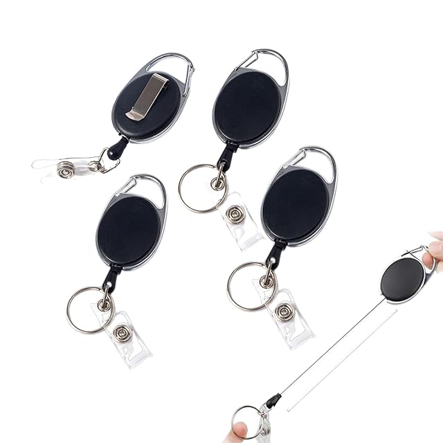[HAPPY SUGAR] 吊り下げ名札用リール キーホルダー 伸縮リール キーリール リールストラップ ピンオンリール カラビナ 紛失防止 アウトドア (ブラック4個セット)