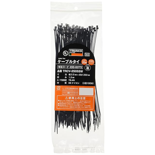 ●色:黒●幅(mm):2.5●長さ(mm):250●厚さ(mm):1.3●引張強度(N):78.4●最大結束径(mm):80●一度締めると、切断しない限り外すことはできません。●屋外用●使用温度範囲:-40〜80℃●耐候性タイプ●UL規格品(94V-2)●耐候性ナイロン66