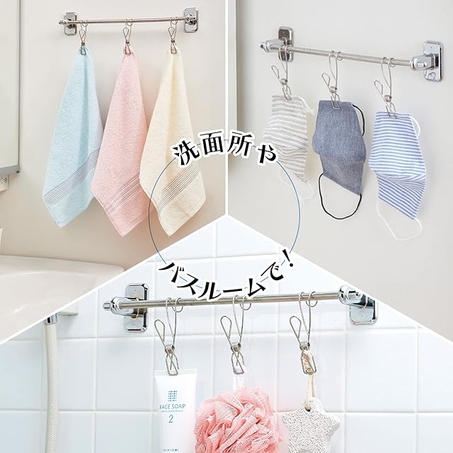 バーなどに引っ掛けることができるフックが付いたステンレスクリップ。