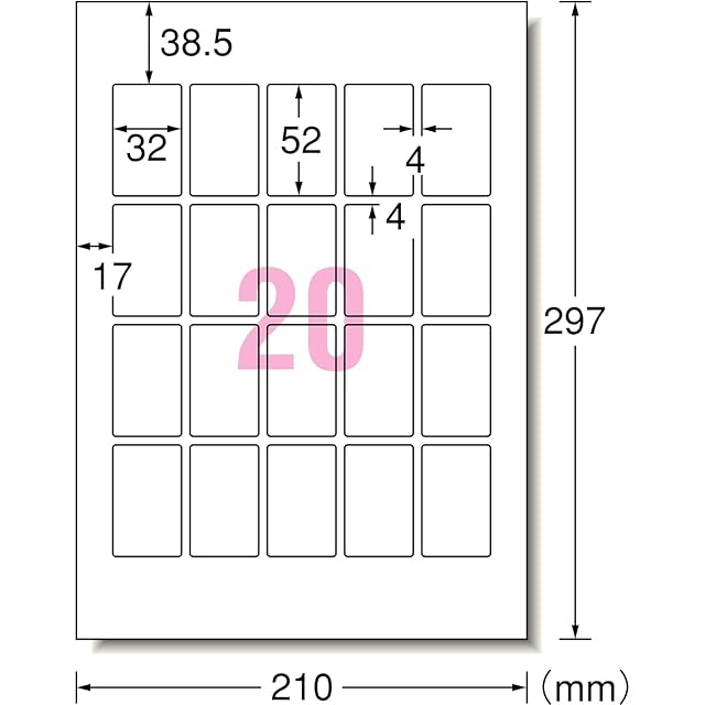 A4判 20面 四辺余白付 角丸/シートサイズ:A4判 (210mm×297mm)/ラベルサイズ:32mm×52mm(5列×4段)