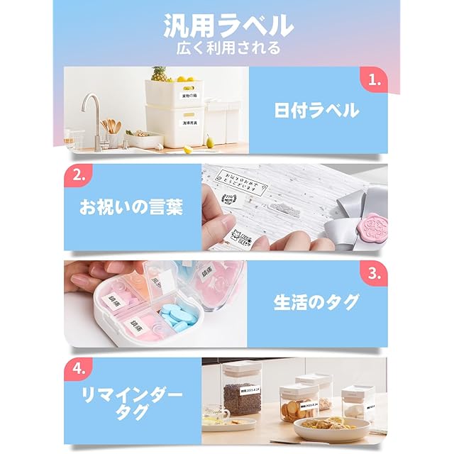 家庭用品や子供用品の整理、化粧品の管理、製品名プレート、キッチン用品、学校やオフィス文書の分類、スタジオ、収納箱などに広く使われています。
