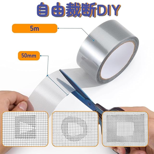 【使いやすさ】紗戸補修テープを必要なサイズや形にカットし、破損部分に貼るだけで、簡単に裂け目や穴を修復できます。工具不要、わずか数秒で完了!