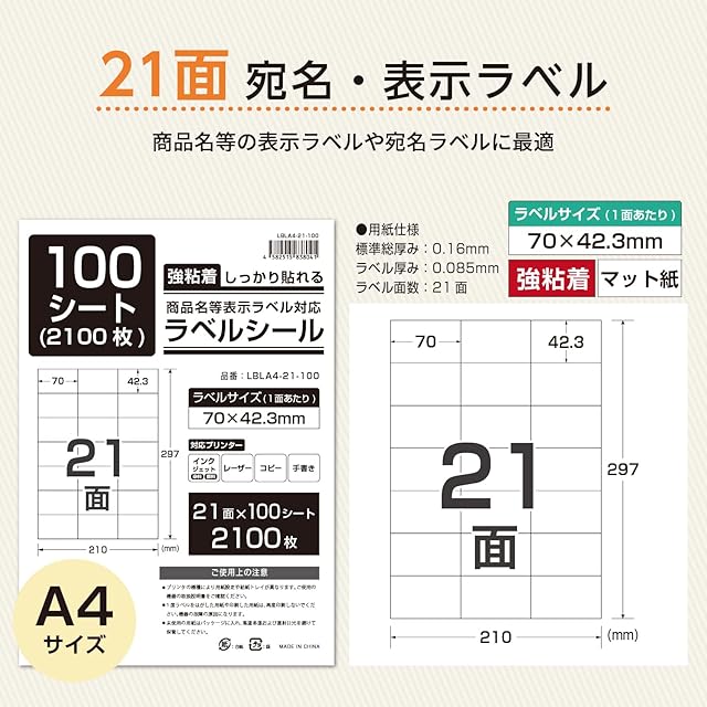 【ラベルシール 強粘着 A4 21面 100シート×3】・A4サイズの21面ラベルシールです。・商品名等表示ラベル対応のサイズです。・その他にも宛名ラベルや識別ラベルとしても最適なラベルシールです。型番:LBLA4-21-100 用紙サイズ:A4(210×297)mm ラベルサイズ:70×42.3mm 21面 ラベル枚数:21面×100シート(2100枚)×3セット 重さ:1パック:1.1kg角の仕様:四角 糊タイプ:強粘着 材質:マット紙 標準総厚み:0.16mm ラベル厚み:0.085mm 対応プリンター:インクジェットプリンター / レーザープリンター注意事項:・プリンタの機種により用紙設定や給紙トレイが異なります。ご使用の機器の取扱説明書をご確認ください。・1度ラベルをはがした用紙や印刷した用紙は、再度印刷しないでください。機器の故障の原因になります。・製品には表裏があります。機器の通紙機構を確認し、正しい位置に置いてください。・未使用の用紙はパッケージに入れ、高温多湿および直射日光を避けて保管してください。・湿度や温度が高くなる場所での保管はしないでください。【対応品番】ラベルタイプ:エーワン互換 21面28363 28383 28923 28924 31257