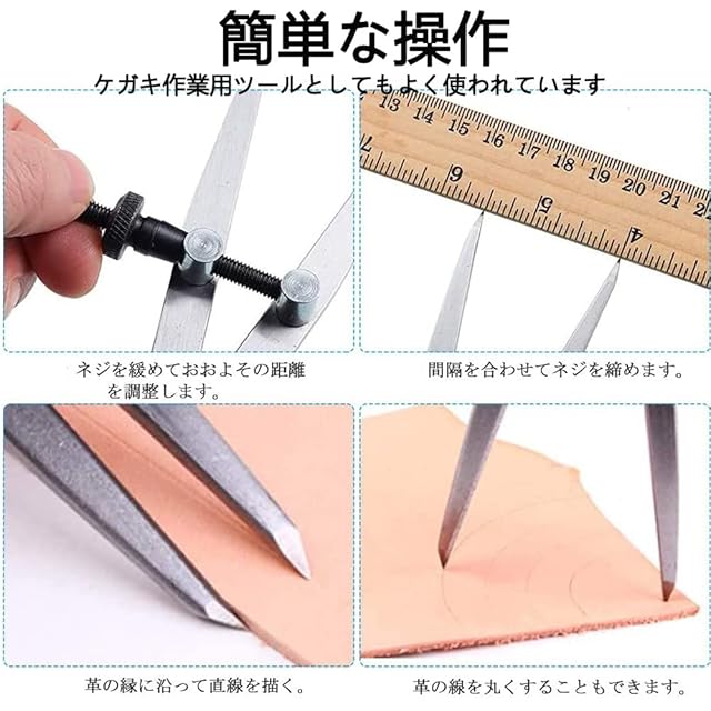 【適用範囲】機械的マーキングおよび皮革製造で広く使用されています。円弧、円、ゲージ、分割線、線分、寸法測定などの描画、木工、金属加工、その他の描画作業などに使用できます。縁の飾り線や菱目打ちや手縫いをするとき、便利です。