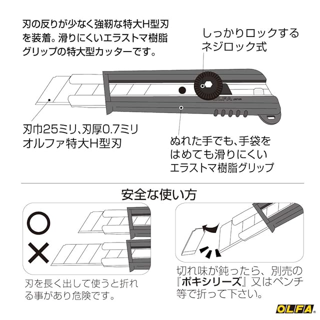 強靭な刃厚0.7ミリの特大H刃を装着。ぬれた手でも、手袋をはめても滑りにくいエラストマ樹脂グリップの特大カッターです。メカニックグローブの購入はこちらハンドクリーナーの購入はこちら