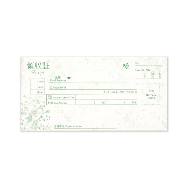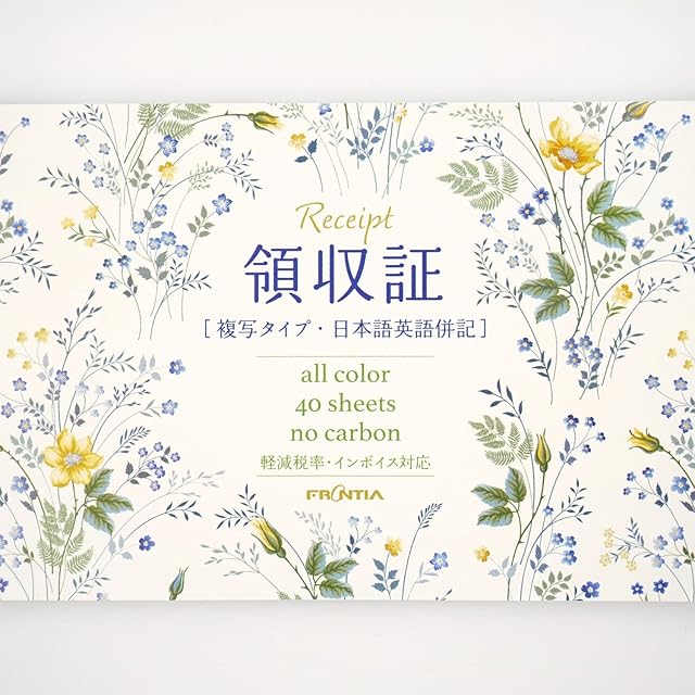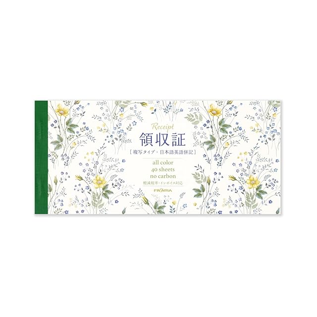 【その他】日本語と英語で表記された軽減税率・インボイス制度対応領収証。ノーカーボン・2枚複写式で小切手サイズ。40シート入り。インボイス制度に対応するよう適格請求書発行事業者の登録番号記入欄あり。野原に咲く草花をデザインしたカワイイ領収証になっています。飲食店や生花店、また、インターネットでこだわりの雑貨を販売される方などにも人気を得ています。