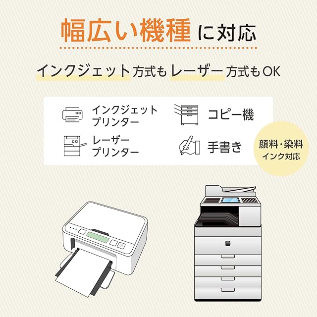 注意事項:・プリンタの機種により用紙設定や給紙トレイが異なります。ご使用の機器の取扱説明書をご確認ください。:・1度ラベルをはがした用紙や印刷した用紙は、再度印刷しないでください。機器の故障の原因になります。:・製品には表裏があります。機器の通紙機構を確認し、正しい位置に置いてください。:・未使用の用紙はパッケージに入れ、高温多湿および直射日光を避けて保管してください。:・湿度や温度が高くなる場所での保管はしないでください。