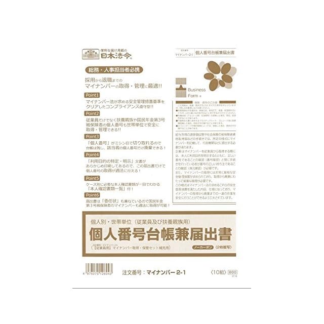 商品名:日本法令 マイナンバー 2-1 個人別・世帯単位(従業員及び扶養親族用)個人番号台帳兼届出書