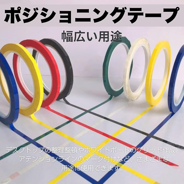 【多用途なマスキング・マーキング】 このポジショニングラインテープは、自己接着性があるため、デスクトップや壁面、床などに簡単に貼ることができます。作業エリアの区分けや目印付け、整理整頓など、幅広い用途に対応します。 デスクトップの整理、マーキング、ラベリング、工芸品作りなど、さまざまな用途にご利用いただけます。