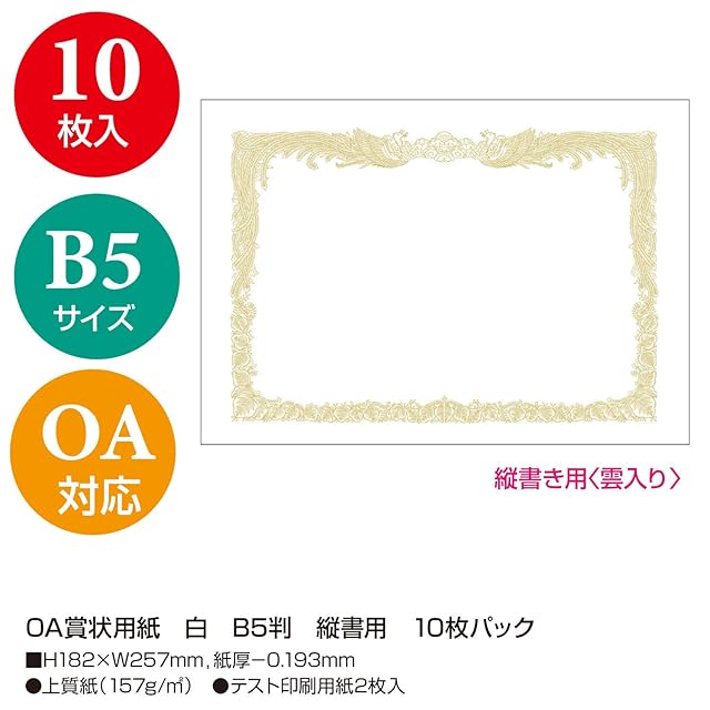 ササガワ 賞状用紙 タカ印 OA対応 縦書き用 白 B5 10枚 10-1050: