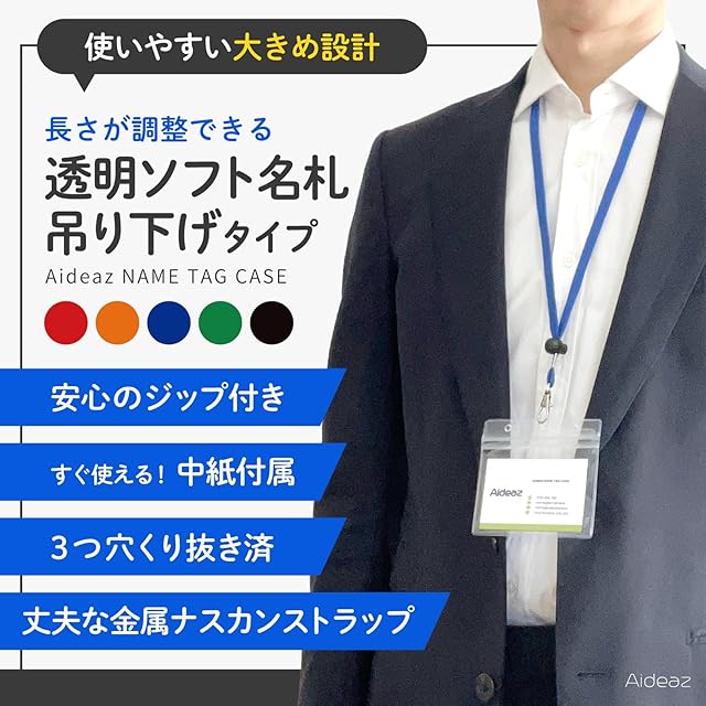 名札 ケース 長さ調整 ストラップ 穴が開かない 首下げ IDカード ホルダー 大きめ 名刺 透明 名札入れ 首掛け 紐 すぐに使える 中紙付き Aideaz (10, 5色アソート)