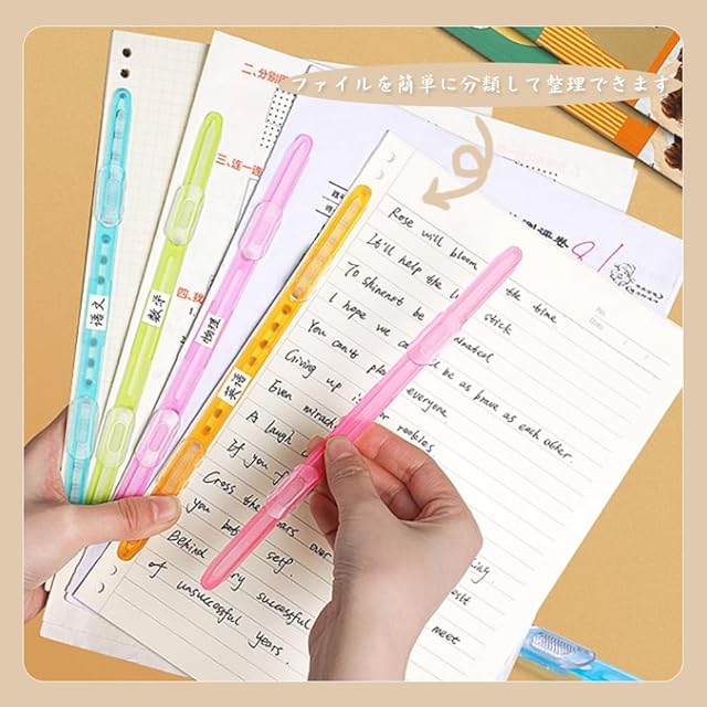 商品詳細:ピンク、ブルー、オレンジ、ライトグリーン、ライトイエロー、クリアホワイトの6色が揃っており、1色2本。オフィス、学校、家庭で使いやすく、ファイルを簡単に分類して整理できます。
