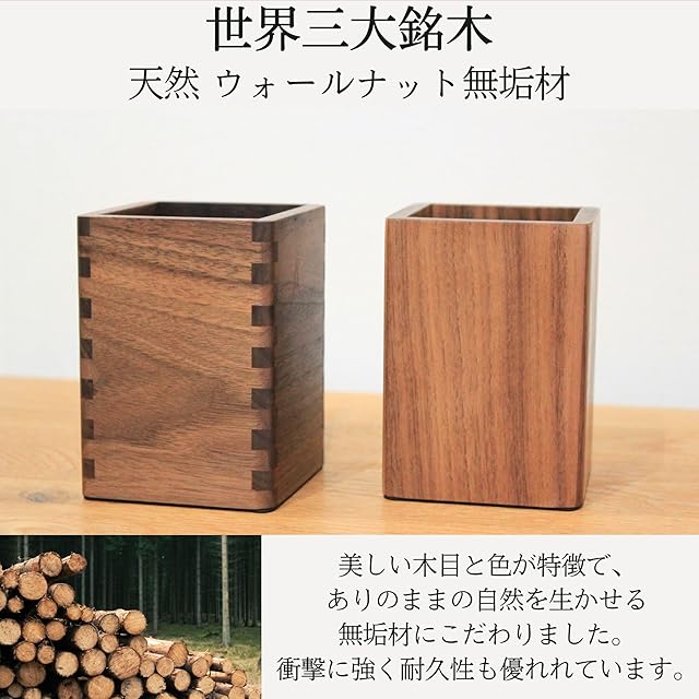 【ウォールナット無垢材】世界三大銘木に数えられる高級木材であるウォールナットの無垢材を使用。美しい木目と色が特徴で、衝撃に強く耐久性に優れたペンスタンドです。滑らかな肌触りと面によって異なる木目をお楽しみいただけます。