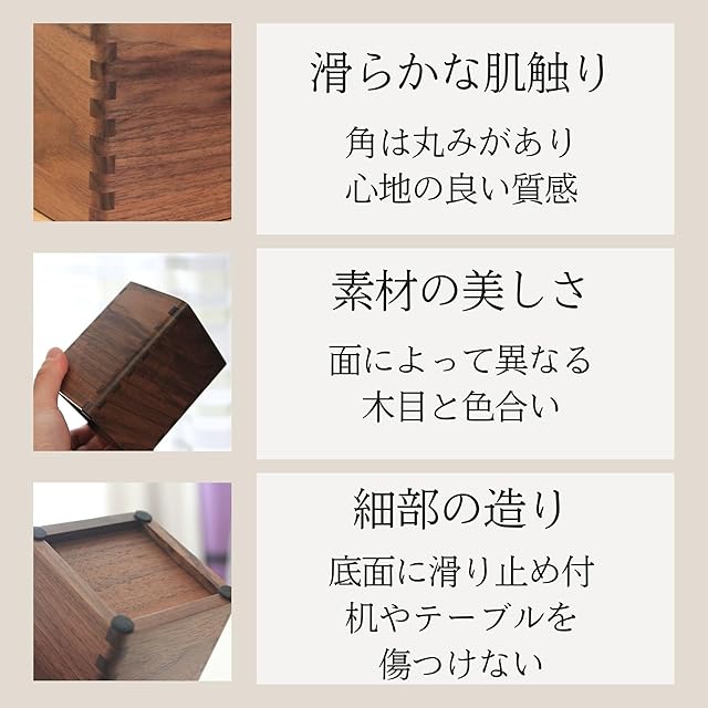 【デザイン性】ウォールナットの天然木目をそのまま生かしたシンプルなデザインと、伝統的な強固な造りの組つぎデザインの2種類をご用意しました。角は丸みを帯びているので、安心してお使いいただけます。深みのあるシックな色合いと美しい木目で、デスク周りやリビングなどのインテリアにも自然と馴染みます。