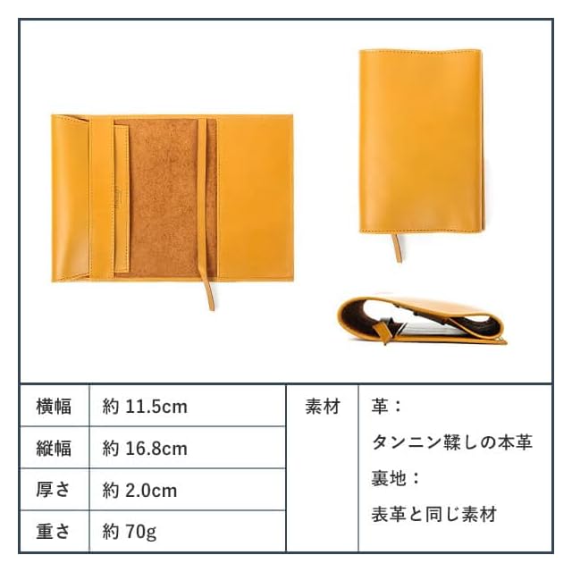 サイズ:高さ16.8 本のサイズ:高さ15.5×幅11×厚み約2cmが入る大きさ。【コシとしなやかさの丁度良いバランス】原皮はバングラデシュ産牛革を使用。コシがありしなやかさも出てくるのが特徴の素材です。本を守る役割とページをめくる役割のどちらも心地よく叶えさせてくれる素材です。