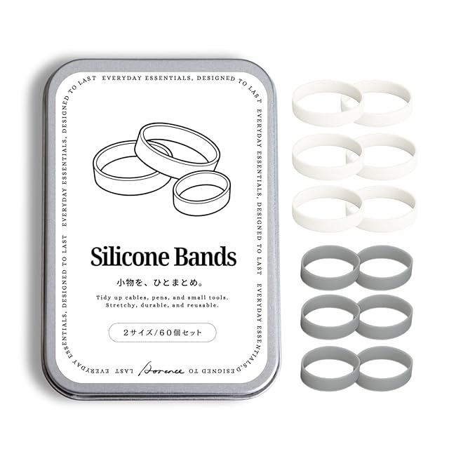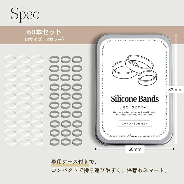 60個入・2サイズ シリコンバンド 滑り止め 優れた弾力性 小物整理用 シリコーン輪ゴム ケーブルや文具の収納に 再利用可 耐久・伸縮性◎ 収納ケース付き (グレー&ホワイト)