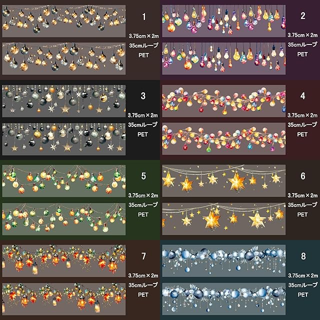 ライトをモチーフにしたテープ型シールです。キラキラと光る貝殻光沢が素敵ですね。デザインが豊富で、どれを使うのかと悩むのも楽しいですね。8個セットなので、全長16mもありますのでたくさん使っていただけます。