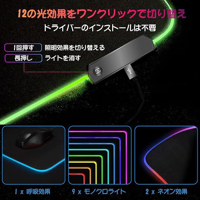 【RGBライト】このゲーミングマウスパッドには、12種類の照明モード(9種類の単色定常光、1種類の色が変わる呼吸ライト効果、2種類のネオンライト効果)があります。鮮やかな色で、ゲームや作業をより楽しくします。