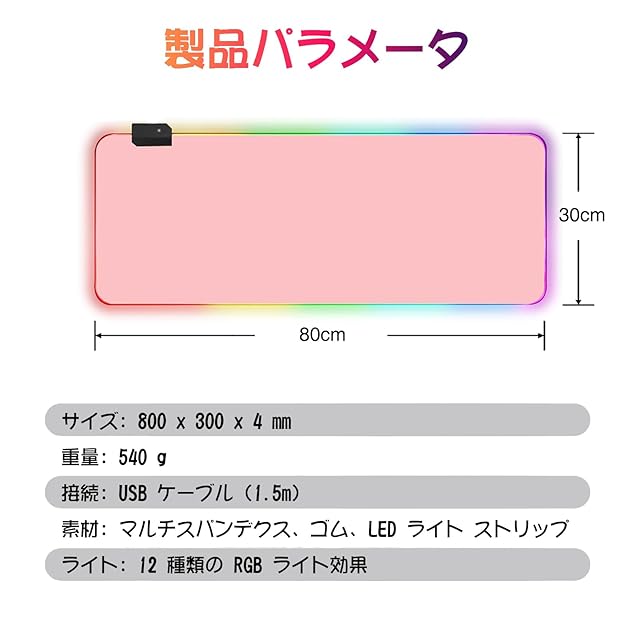 大型マウスパッド ゲーミング マウスパッド 12 種類のRGB照明効果 防水マルチスパンデックス表面 滑り止めゴムベース 800*300*4mm (ピンク)