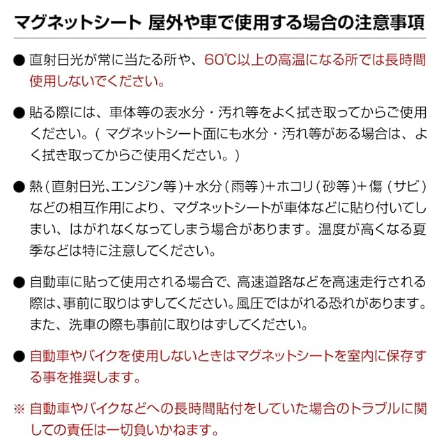 【マグネットシート 屋外や車で使用する場合の注意事項】■直射日光が常に当たる所や、60℃以上の高温になる所では長時間使用しないでください。 ■貼る際には、車体等の表水分・汚れ等をよく拭き取ってからご使用ください。(マグネットシート面にも水分・汚れ等がある場合は、よく拭き取ってからご使用ください。) ■熱(直射日光、エンジン等)+水分(雨等)+ホコリ(砂等)+傷 (サビ)などの相互作用により、マグネットシートが車体などに貼り付いてしまい、はがれなくなってしまう場合があります。温度が高くなる夏季などは特に注意してください。 ■自動車に貼って使用される場合で、 高速道路などを高速走行される際は、事前に取りはずしてください。風圧ではがれる恐れがあります。また、洗車の際も事前に取りはずしてください。 ■自動車やバイクを使用しないときはマグネットシートを室内に保存する事を推奨します。※自動車やバイクなどへの長時間貼付をしていた場合のトラブルに関しての責任は一切負いかねます。