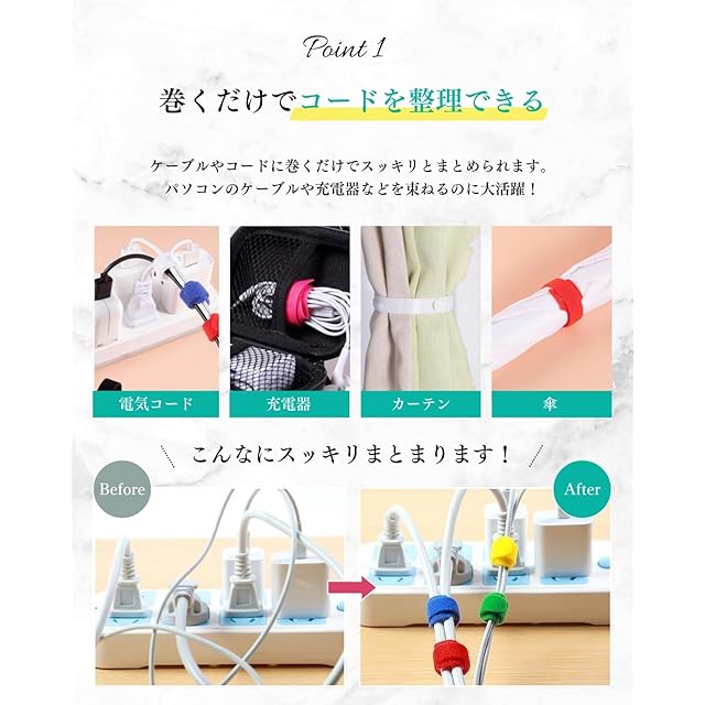 ✅【多用途使用】 家庭、オフィス、ガレージなどでのコード整理や収納に最適。ケーブル配線、おもちゃ、家電コード、ノートPCアダプタなど様々な用途に対応。ガーデニングにも使え、植木などの固定にも便利です。火の近くや直射日光の当たる場所では使用しないでください。