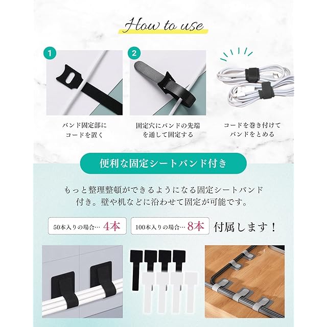 ✅【固定シートバンドを付属】50本入り商品は4本、100本入り商品は8本、それぞれまとめたケーブルを浮かして固定出来る固定シートバンドを付属しております。浮かして固定したり、お部屋やオフィスの隅にケーブルを束ねておきたい際などに活躍するので、組み合わせてご使用いただく事でより便利にケーブルを整理する事が出来ます。