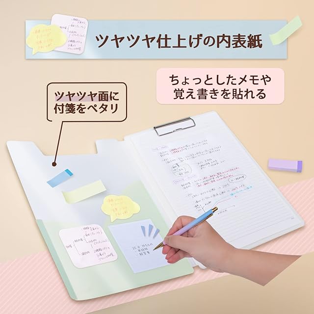 Pastyファイルシリーズ・ペンケースと合わせてカラー統一や組み合わせが楽しめる!<br>表紙ポケットにA4プリントから付箋などの小物類を収納でき、一時保管や持ち運び便利なパステルカラーのクリップファイル。
