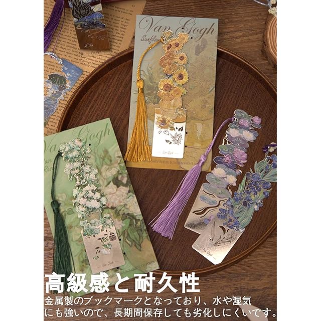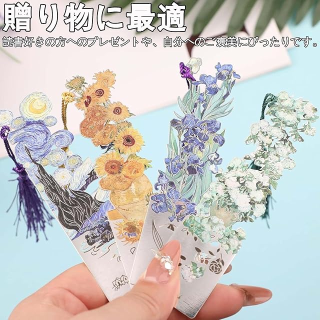 【芸術的なデザイン】透かし彫り加工が施された芸術的なデザインは、ギフトにも最適です。有名油絵画をモチーフにした8種類のデザインから選択可能。金属プレートに精巧な透かし彫り加工を施し、光に透かすとより美しく輝きます。読書の楽しみを倍増させるおしゃれでよくできた金属製のしおりです。