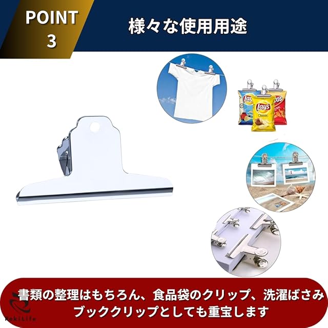 【様々な使用用途】書類の整理はもちろん、食品袋のクリップ、洗濯ばさみ、ブッククリップとしても重宝します。事務作業から家庭の片付けまで、さまざまな場面で使いやすく、ひとつあるだけで幅広い用途に対応できます。