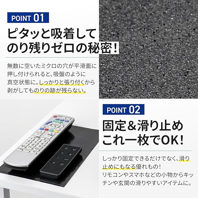 【厚手2mmでクッション性の高い滑り止め、壁に圧着すれば貼ってはがせる仮固定】 厚さ2mmの厚手設計で、物を上に置いた時は衝撃吸収性高い。また、小さな凹凸があっても面に追従するためしっかり吸着する高機能な滑り止めです。