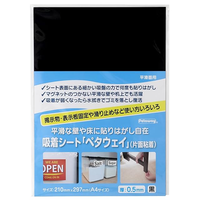 【厚手2mmでクッション性の高い滑り止め、壁に圧着すれば貼ってはがせる仮固定】 厚さ2mmの厚手設計で、物を上に置いた時は衝撃吸収性高い。平滑な壁面には、強い吸着性で表示板や掲示物などを貼ったりはがしたりマグネットのように使える。また、厚みがあるため指に引っかかりやすく作業性高い。