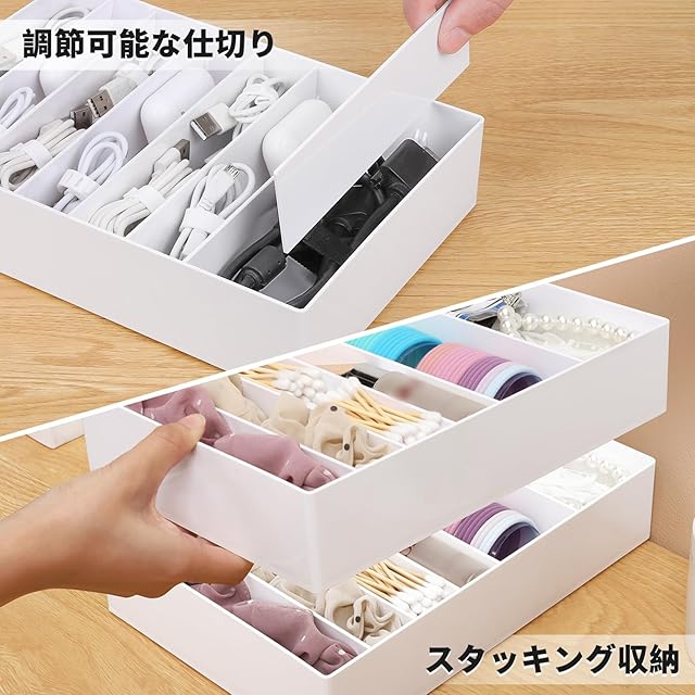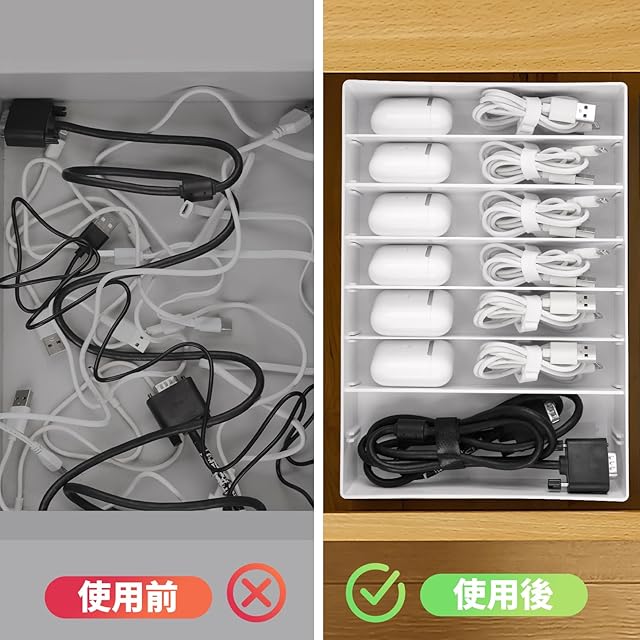 【取り外し可能な仕切り】 充電ケーブル収納ボックスの仕切りは取り外し可能で、使用ニーズに応じてコンパートメントのサイズとスペースを調整することができ、拡大された仕切りにより、充電器、ヘッドフォンケースなどを簡単に収納することができます。 実用的な設計で、スペースを上手に整理でき、収納と整理が柔軟で便利です。机の上をごちゃごちゃした配線やケーブルから解放します。