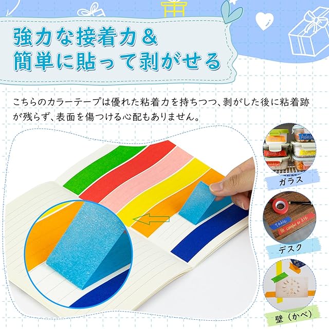 ✨【強力な接着力&簡単に貼って剥がせる】 一般的なマスキングテープと比べて、こちらのカラーテープは優れた粘着力を持ちつつ、剥がした後に粘着跡が残らず、表面を傷つける心配もありません。プラスチック、ガラス、紙、金属、黒板、壁、床など、さまざまな滑らかな表面にしっかりと貼り付けることができ、簡単に貼り直しも可能です。