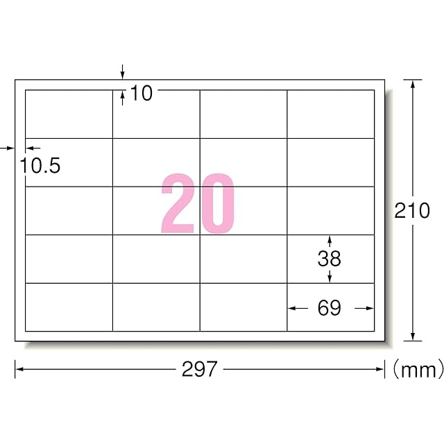 A4判 20面R型 宛名・表示用/シートサイズ:A4判 (210mm×297mm)/ラベルサイズ:69mm×38mm(4列×5段)