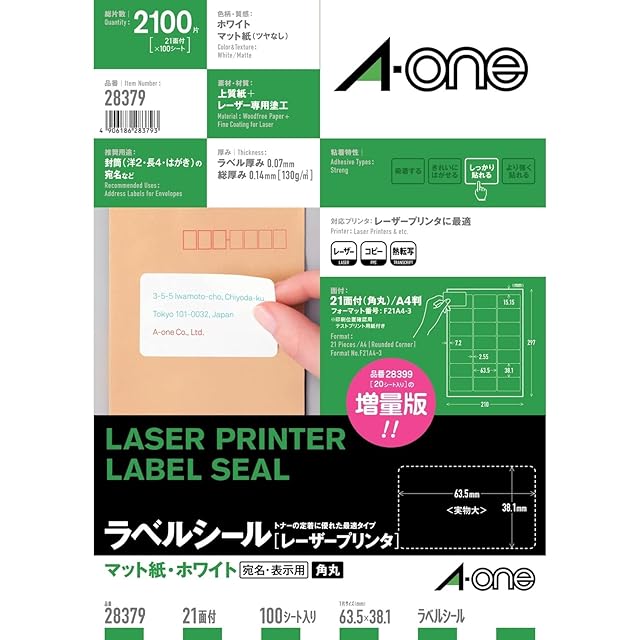 A4判 21面 四辺余白付 角丸/シートサイズ:A4判 (210mm×297mm)/ラベルサイズ:63.5mm×38.1mm(3列×7段)