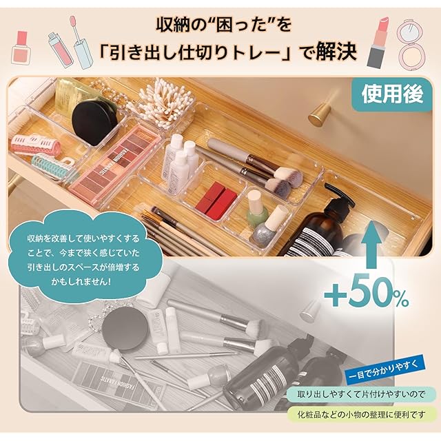 ✅仕切りの無い引き出しの中には様々な物が散らかりがち。いつの間にか物が増えてどう整理したらいいか分からないなんてことありませんか?「収納ケース 引き出し 仕切り」はそんなお悩みを一気に解決!沢山物が増えた引き出し内も綺麗にすっきり整理することが出来ます。