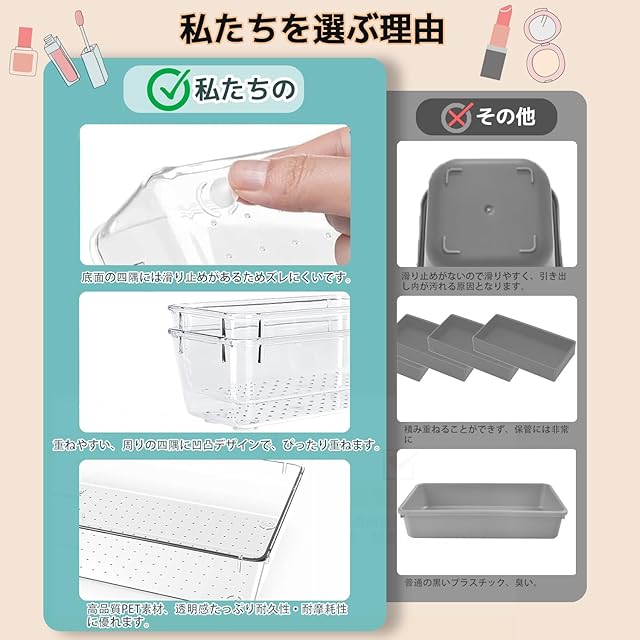 ✅4種サイズ、8個セット✅2個7.6*7.6*5.3cm、2個15.2*7.6*5.3cm、2個23*7.6*5.3cm、2個23*15.2*5.3cm。材質: PET材質。透明なデザインなので、必要なものをすぐに見つけることができます。追加の100個のシリコンパッドが含まれており、プラスチックトレイの底に貼り付けるだけで滑り止めになります。