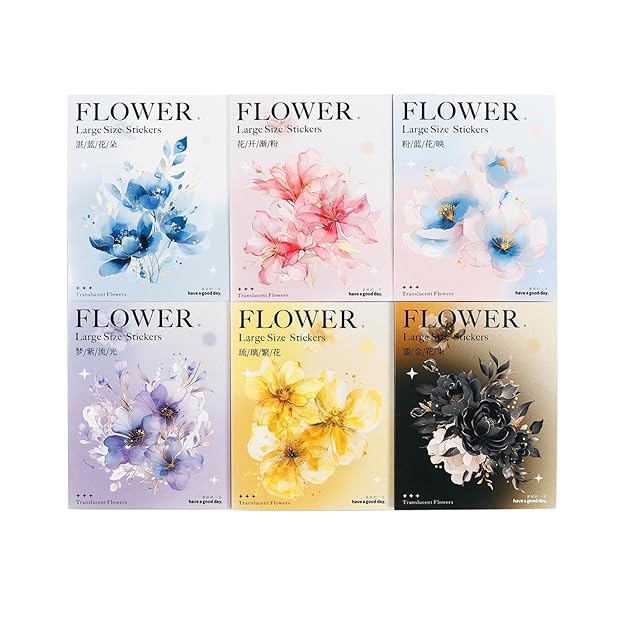 【大きなサイズの花のコラージュ 素材】半透明で水に強いPETのステッカー が6パック入り。各パックには10種類の異なるデザインがあり、1枚/デザイン、合計で10枚。合計60枚。製品サイズ:10cm×10cm以内。十分な数量で、友達と共有して使うこともできます。