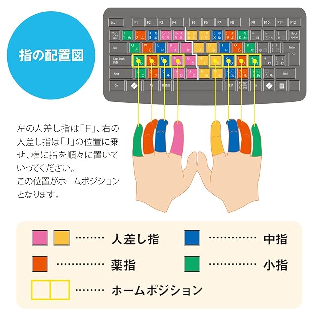 【ホームポジション習得に最適】キーごとに色分けされたデザインで、指の配置を視覚的に覚えられます。子供や初心者でも直感的にタッチタイピングを習得しやすい設計です。