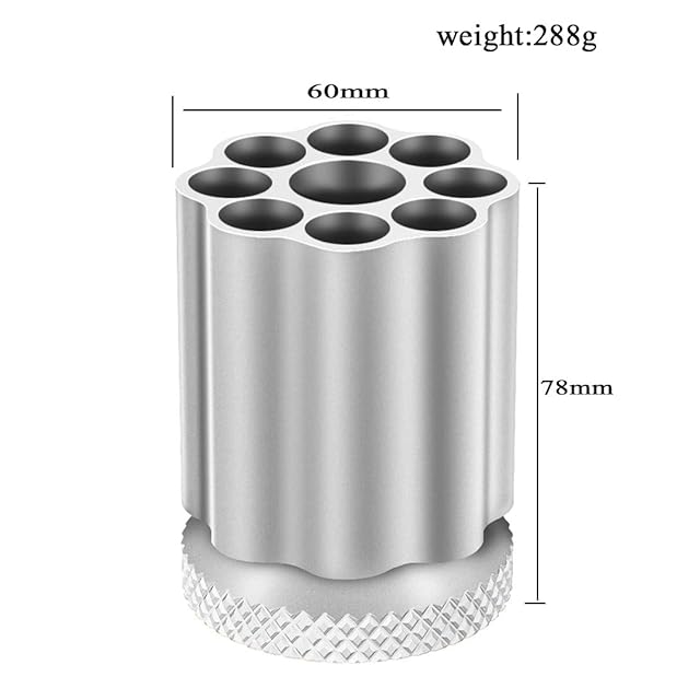 独特な銃身デザインの筆箱!上部はペン立て、下部はベースで、二つの部分は順滑軸受けにより繋がっています。9つの穴があり、真ん中の穴の直径は23mmで、周りの穴の直径は14 mmで、深さは60 mmです。あなたのペンと他の小さいサイズの事務用品が入れます。
