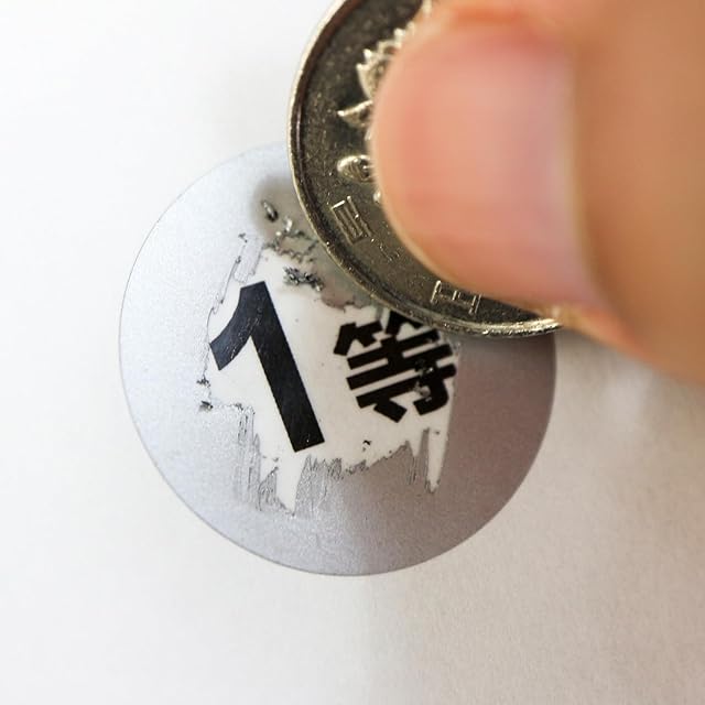 【特 徴】スクラッチシールは、コインや爪などの硬い物でこすると表面のコーティングだけが削れ、下に隠した文字や絵柄などを表示することができるシールです。イベントやパーティでのくじ引きゲームで大活躍の削れるシールですが、情報保護にも使用されるなどアイディア次第で様々な用途にご使用していただけます。