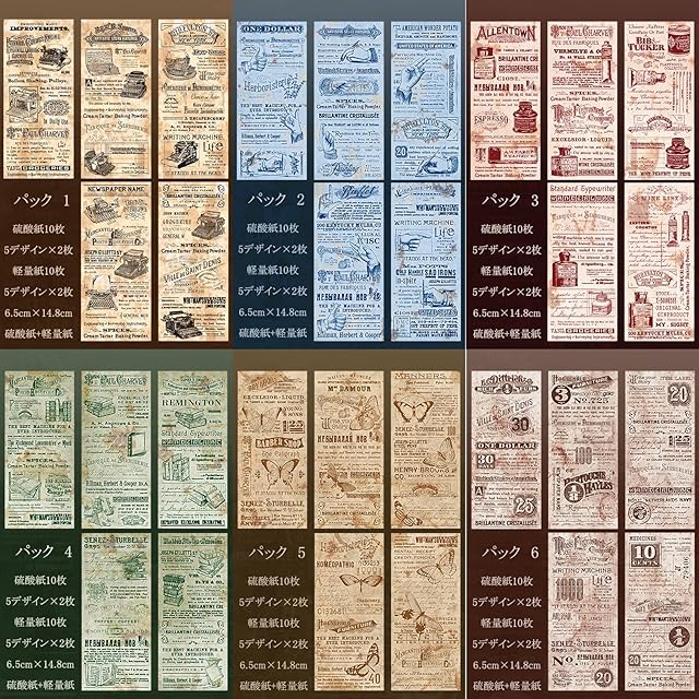 ❤レトロ風のコラージュ素材紙セットです。硫酸紙と軽量紙の2種類の紙で、異なる雰囲気を一括にゲットできます。6パックセット合計120枚入りの大容量で、たくさん使えますね。